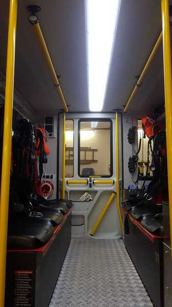 Bereits auf der Anfahrt können sich bis zu 4 Einsatzkräfte mit Pressluftatmern ausrüsten.