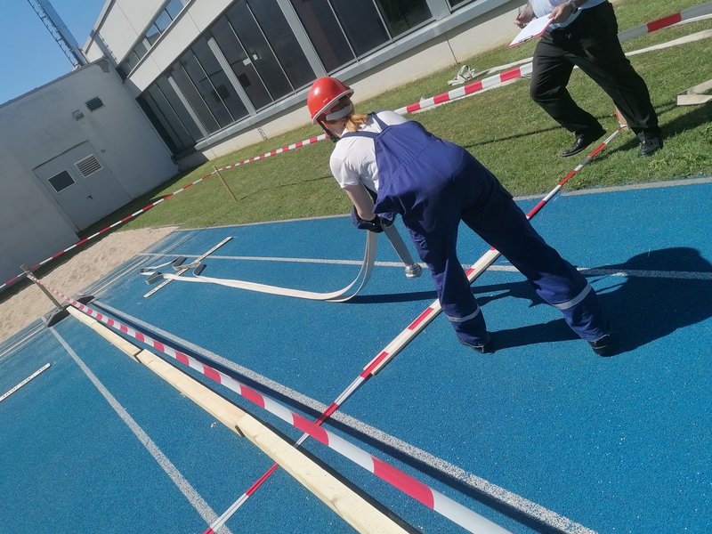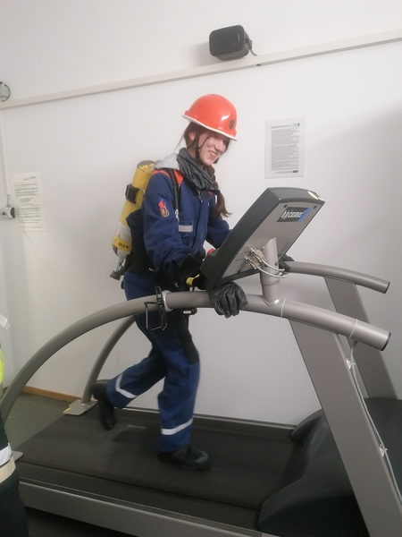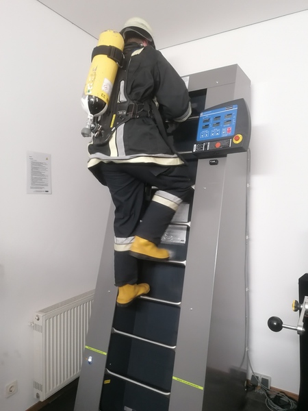 Zu bewältigen war eine Endlosleiter auf der man 18 Meter Höhe mit einer Geschindikgkeit von 18 Mitern die Minute laufen muss. Dannach noch 130 Meter auf dem Laufband und ein Armergometer. Das Highlight war natürlich "der Käfig". Eine Übungsstrecke mit vielen Hindernissen, welche zu überwinden waren.