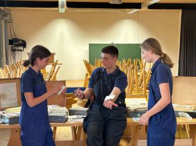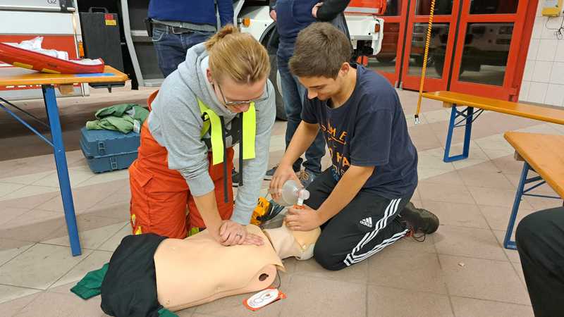 Am 27.10. kam das Bayerische Rote Kreuz zu uns und frischte unser Wissen in Erste Hilfe auf. Zu allererst schauten wir uns unseren neuen Erste Hilfe Rucksack an. Die mitgeführten Gegenstände erklärte uns Eva Wecker und teilte uns mit, welche wir benutzen dürfen / können und welche nicht. Als nächstes wendeten wir uns der Praxis zu. So durfen wir selber eine Herzdruckmassage und Druckverbände durchführen.