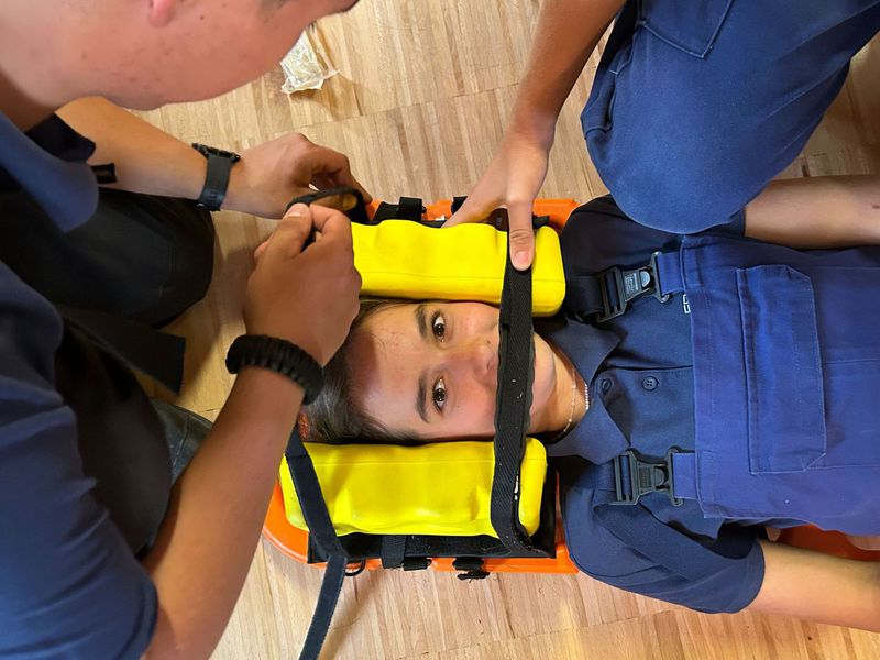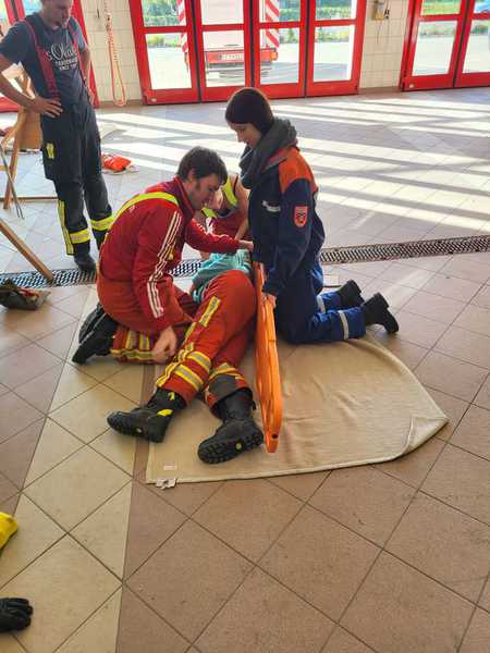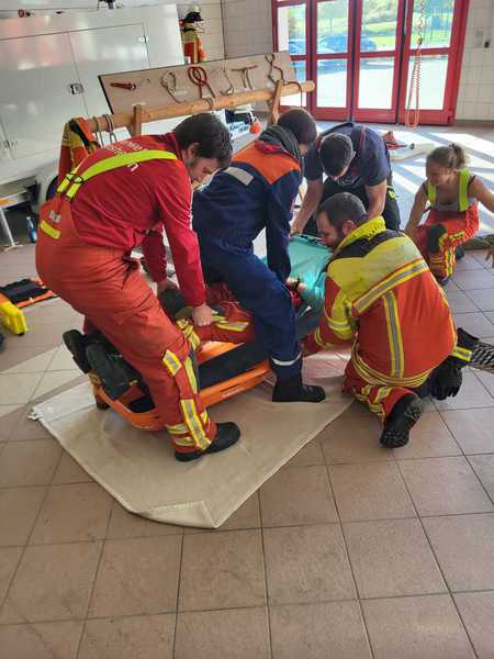 Um die verletzten Personen auch von der Unfallstelle weg transportieren zu können, nahmen wir auch unser neues Spinebord sowie die Schleifkorbtrage und das Tragetuch durch.