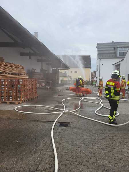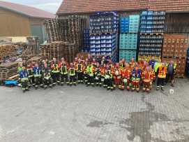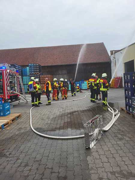 Angenommen wurde ein Brand in einer Lagerhalle der Firma Getränke Glosser bei dem zwei Mitarbeiter vermisst wurden. Gemeinsam mit unseren beiden Nachbarfeuerwehren wurde zügig die Brandbekämpfung eingeleitet. Mehrer Trupps unter Atemschutz drangen in die brennende Halle vor, um die vermissten zu retten. Zusätzlich mussten angrenzende Gebäude vor einem Übergreifen des Feuers geschützt werden.