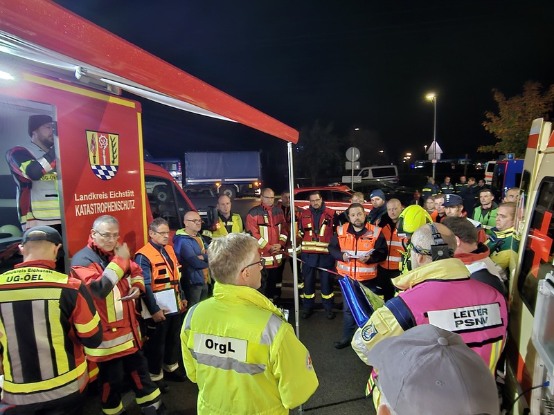 In der Nacht am 22.10.23 um halb 1 startete die Katastrophenschutzübung im ICE-Tunnel Schellenberg bei Kinding. Alamiert wurden wir zu einer lebensbedrohlichen Lage (Lebel im Fachjargon). In diesem Szenario war die lebensbedrohliche Lage ein Amoklauf, bei dem mehrere Passagiere des Zuges mit einem Messer verletzt wurden. Die Polizei konnte den Täter festnehmen und der Rettungsdienst begann, die Verletzten zu sichten und zu kategoriesieren. Zunächst fuhren wir in den Bereitstellungsraum in Kipfenberg. Von dort werden die nachrückenden Feuerwehren (Feuerwehren die nicht an einem ICE-Tunnel liegen) koordiniert. Nachdem die Erkundung abgeschlossen war, wurde klar, dass mehrere Einsatzkräfte im Tunnel benötigt werden. Also fuhr das Eitensheimer HLF zum Kindinger Bahnhof. Zusammen mit der Feuerwehr Eichstätt unterstützen wir die Feuerwehr Kipfenberg mit Schleifkorbtragen beim Transport der Verletzten aus dem Tunnel zum Bayerischen Roten Kreuz, für die weitere Versorgung.