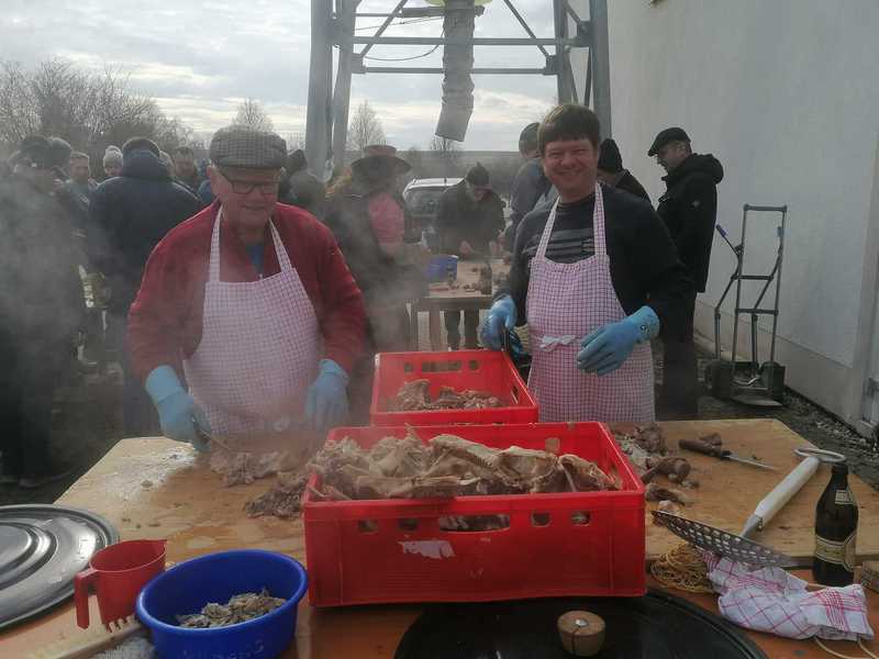 Durch Herbert Hammerer und seinen Vater konnten sich unsere Kammeraden das Kesselfleisch wieder schmecken lassen. Das übrig gebliebene Fleisch wurde im Anschluss direkt zu Würsten verarbeitet.