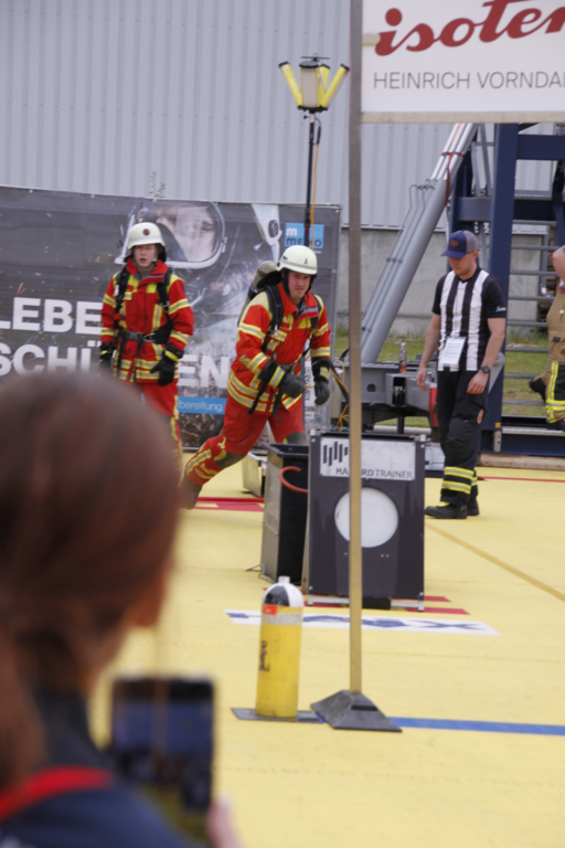 Im Tandemlauf zog der erste Starter das Atemschutzgerät an und tauschte bei der Übergabe an den Tandempartner die Atemluftflasche aus.