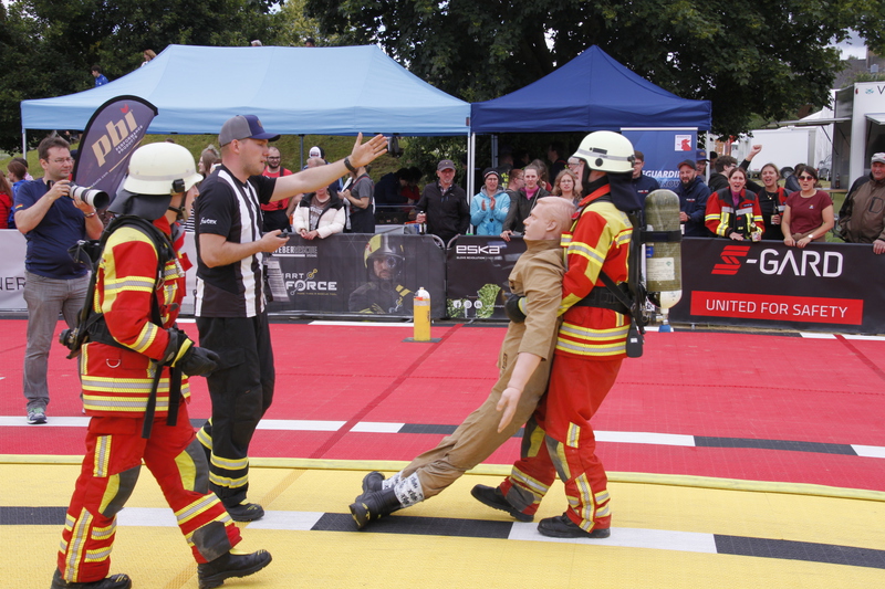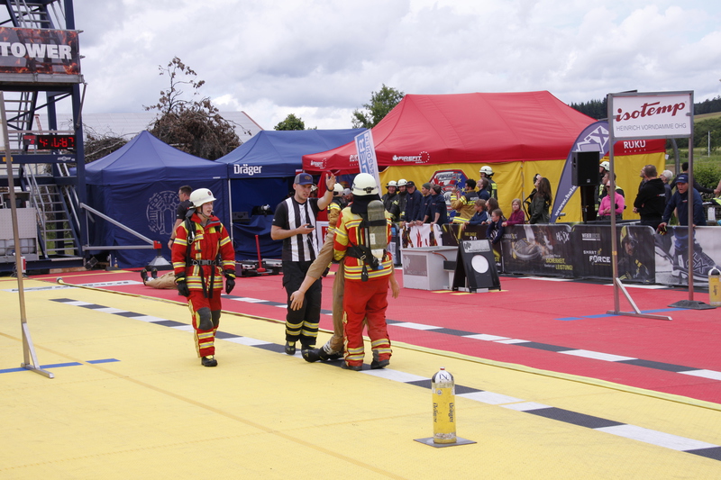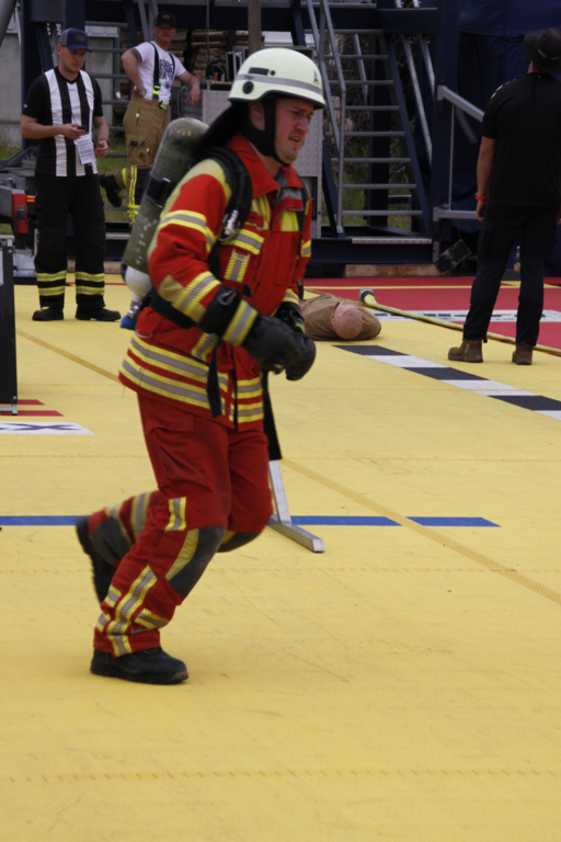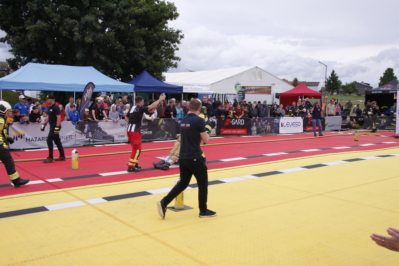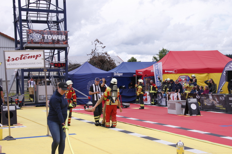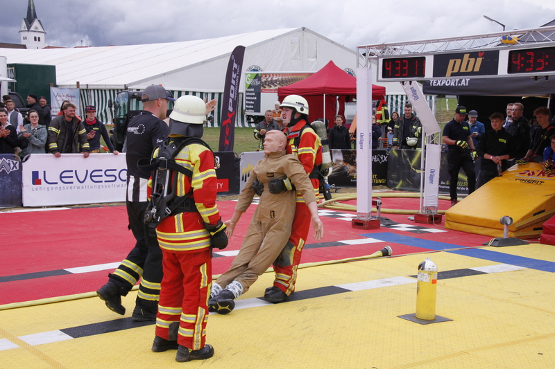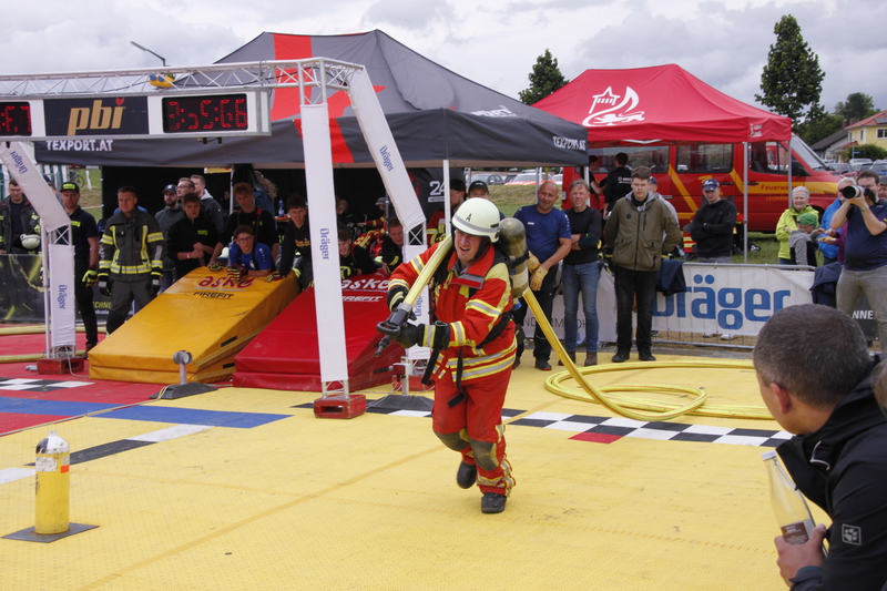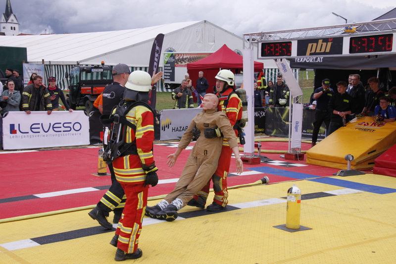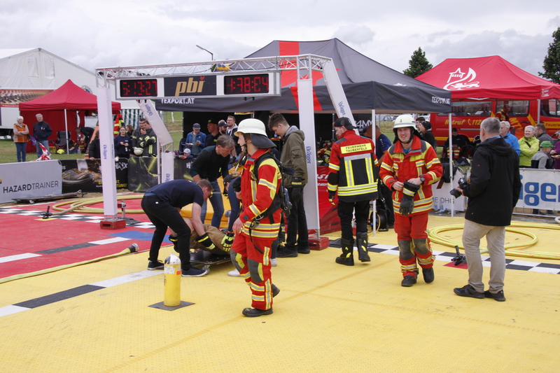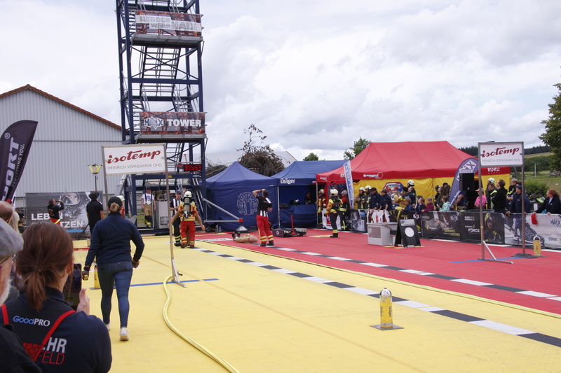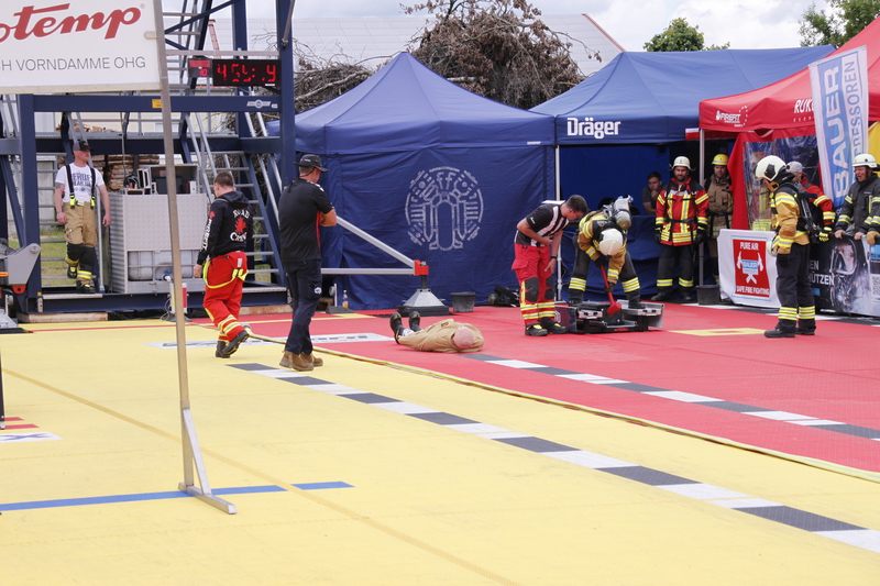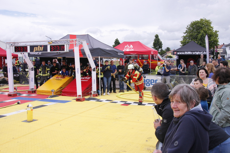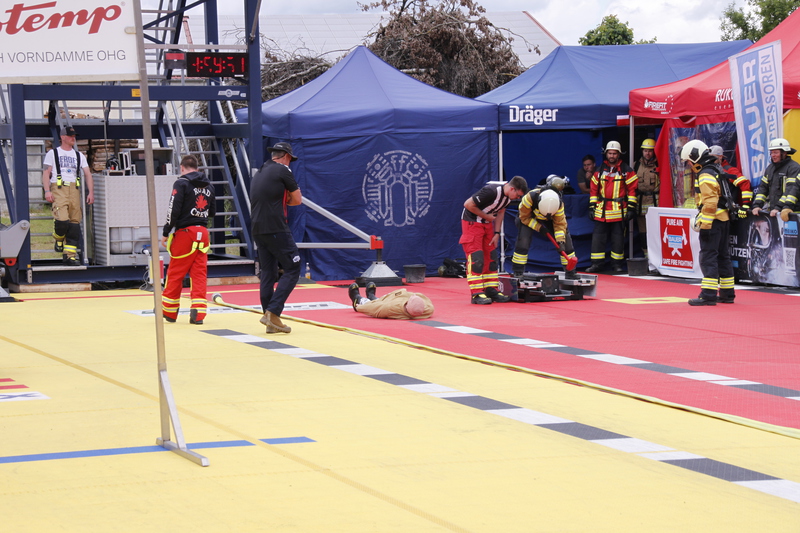 Am anderen Ende des Platzes wartete ein unter Druck stehender C-Schlauch auf den Teilnehmer, der 23 m über den Platz gezogen und dabei ein simulierter Brand gelöscht werden sollte. Den krönenden Abschluss bildete die Rettung einer Person, wo ein 80kg schwerer Dummy 30 m ins Ziel gezogen wurde.