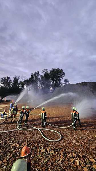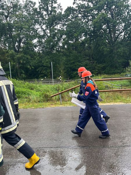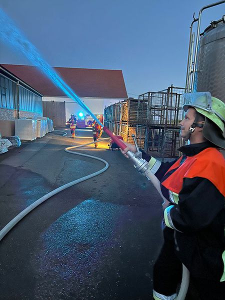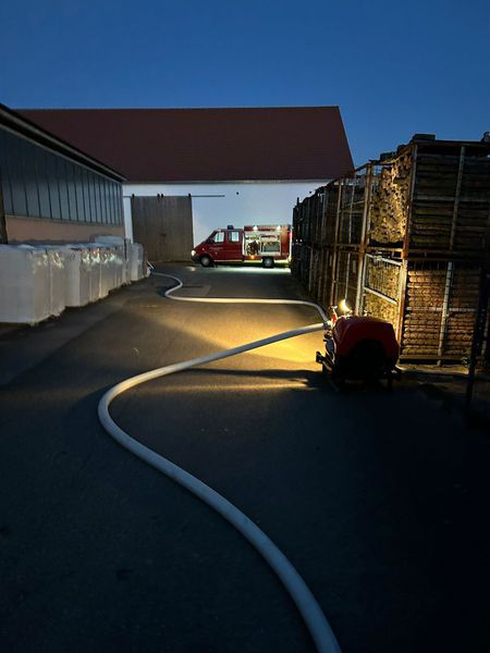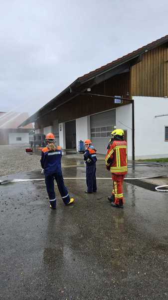 Um eine konstante Wasserversorung sicherzustellen, mussten etwa 350 Meter Schlauch zum nächsten Hydrant verlegt werden. Dies erforderte den Einsatz einer Verstärkerpumpe, um den nötigen Wasserdruck über die lange Distanz aufrecht zu erhalten. Zusätzlich wurde eine zweite Wasserentnahmestelle eingerichtet, die aus einem mit Wasser gefüllten Güllefass bestand. Das Hilfeleistungslöschfahrzeug (HLF) leuchtete die Einsatzstelle mit seinem Lichtmast aus. Zeitgleich bauten die Jugendlichen noch ein Stativ auf, um weitere Bereiche der Einsatzstelle auszuleuchten. Um den Löschangriff effizient zu gestalten, wurden zwei Verteiler gesetzt. Dadurch konnten sechs Trupps gleichzeitig das Feuer bekämpfen.
