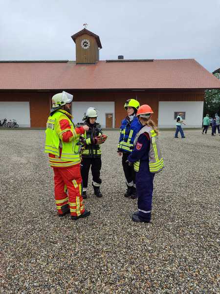 Oberste Priorität hatte die Menschenrettung. Dementsprechend rüsteten sich drei Trupps mit Atemschutzattrappen aus und begaben sich vorsichtig in die verrauchte Halle. Währenddessen blieben drei weitere Trupps unter Atemschutz (ebenfalls Attrappen) draußen in Bereitschaft, um im Notfalls helfen zu können. Draußen arbeiteten die anderen Jugendlichen daran eine stabile Wasserversorgung aufzubauen. Sie rollten Schläuche aus und schlossen diese an Hydranten und einem Güllefass, gefüllt mit Wasser, an. Gleichzeitig wurde eine Verletztensammelstelle eingerichtet, um die geretteten Personen schnell versorgen zu können. Nachdem die Personen in der Halle gerettet wurde, bauten die Jugedlichen einen Löschangriff und zwei provisorische Wasserwerfer auf.