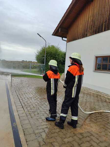 Hierbei musste ein angenommener Brand eines Nebengebäudes im Außenangriff gelöscht werden. Ziel war es, hierbei mit Wasser gefüllte Eimer von einem Podest zu spritzen.