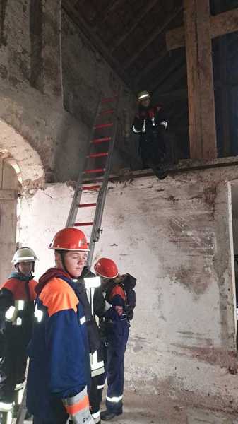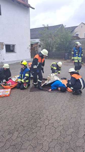 Nach ihrer Ankunft betraten die Jugendlichen, ausgerüstet mit Atemschutzattrappen, das beschädigte Wohngebäude, um die vermissten Personen zu suchen und zu retten. Zwei weitere Trupps rüsteten sich ebenfalls mit Atemschutzattrappen aus und hielten sich in Bereitschaft. Zeitgleich kümmerten sich andere Jugendliche um die verletzten Personen im Garten. Sie leisteten Erste Hilfe und beruhigten die unter Schock stehenden Betroffenen. Da das Feuer bereits auf den benachbarten Stall übergegriffen hatte, bauten weitere Jugendliche eine Wasserversorgung auf und begannen mit dem Löschangriff. Parallel dazu retteten die restlichen Jugendlichen die Person, die sich im Stall auf einer Erhöhung befand, mittels einer schiefen Ebene.
