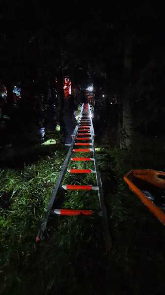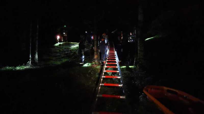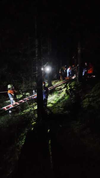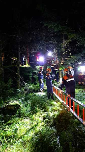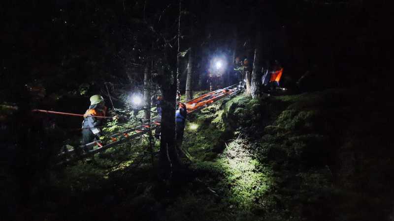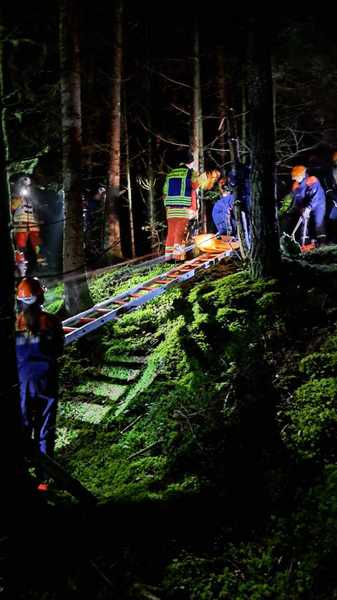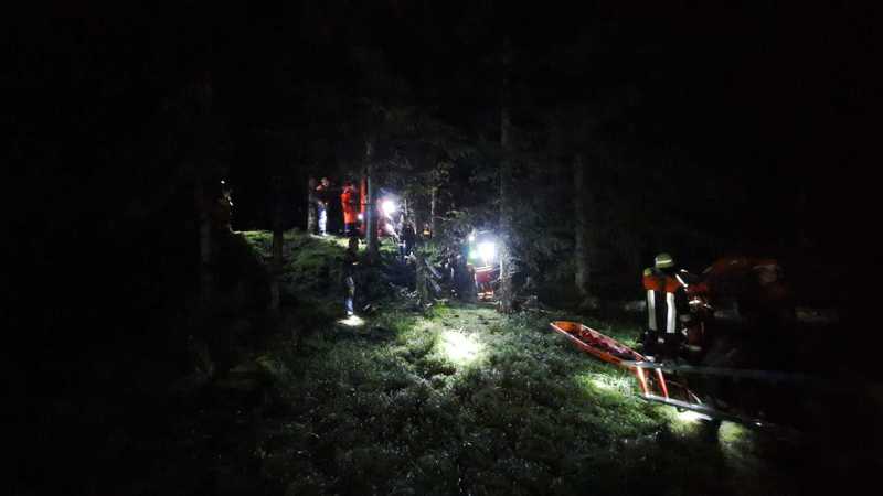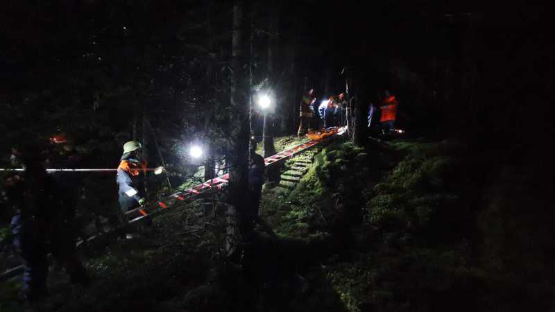Sofort machten sich die Einsatzkräfte auf den Weg zum angegeben Ort. Bereits auf der Anfahrt wurde das Gebiet in mehrere Suchgebiete aufgeteilt. Aufgrund der Dunkelheit und des unwegsamen Geländes gestaltete sich die Suche schwierig. Mit Taschenlampen und Wärmebildkameras durchkämmten die Jugendlichen die Gebiete. Nach einer Stunde Suche konnten die beiden Wanderer schließlich gefunden werden. Der verletzte Wanderer wurde erstversorgt und anschließend mit einer Trage aus dem Wald gebraucht.