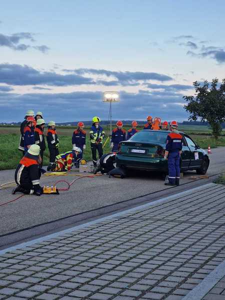 Die Jugendlichen stellten Pylonen, Warndreiecke und Blitzlampen zur Absicherung auf. Da es noch leicht dämmerte, wurde zusätzlich ein Stativ mit Beleuchtung aufgebaut. Der MTW übernahm den Brandschutz und die Betreuung der Patienten, während sich das HLF um die Befreiung des unter dem PKW eingeklemmten Fahrradfahrers kümmerte.